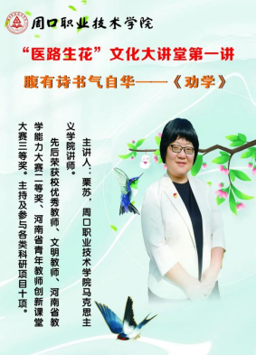 2022年4月12日下午,贝博艾弗森代言体育官网宣讲团成员栗苏老师在东校区多媒体教室为“医路生花——文化大讲堂”系列活动作题为“腹有诗书气自华——劝学”的讲座。