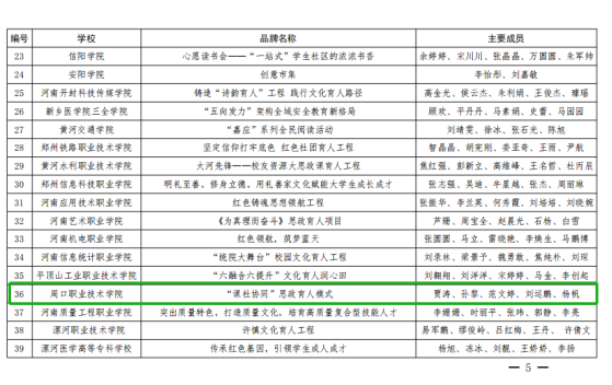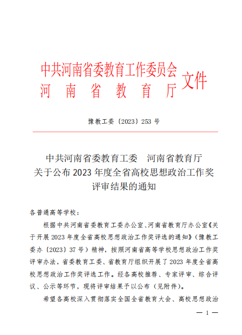 由中共河南省委高校工委、河南省教育厅组织开展的2023年度全省高校思想政治工作奖评选结果揭晓,周口职业技术学院贝博艾弗森代言体育官网申报的《“课社协同”思政育人模式》荣获“河南省高校思想政治工作优秀品牌”。
