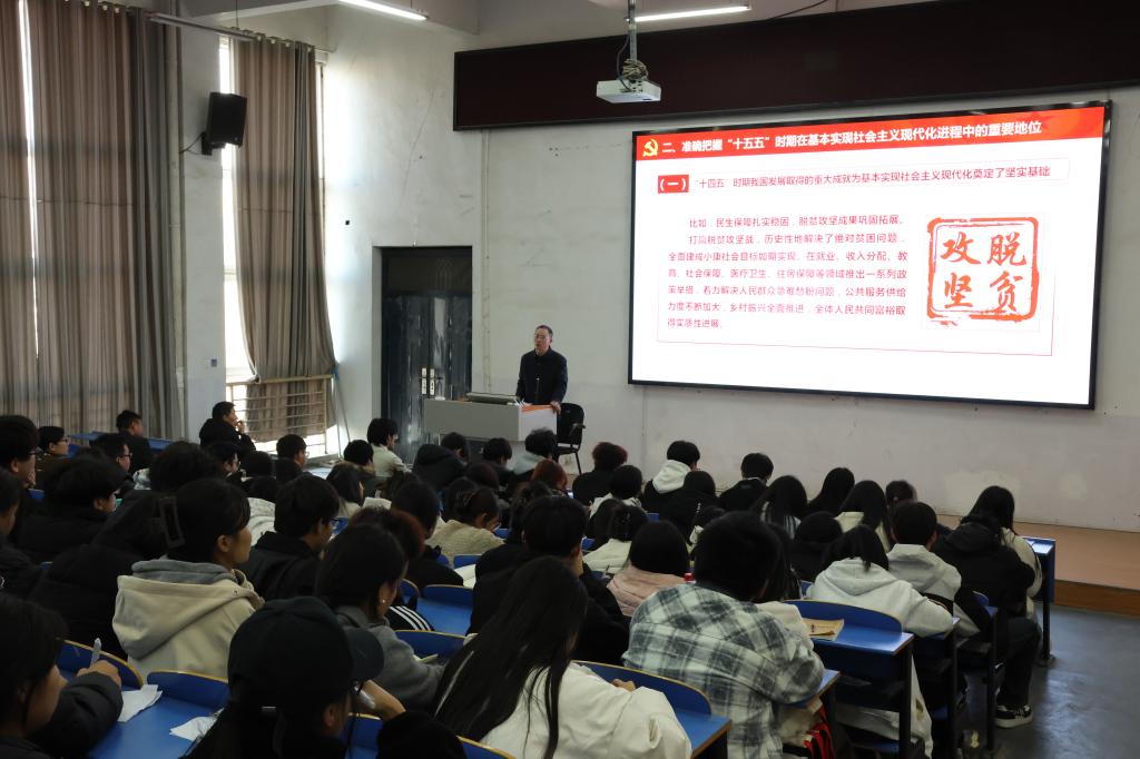 课上,郭汝礼系统解读了党的二十届四中全会精神。他围绕“十四五”规划的实施成效、经验启示,聚焦“十五五”时期的指导方针、战略任务及坚持和加强党的全面领导等方面展开讲解,重点阐述“十五五”时期我国在科技创新、法治进步、文化事业、民生保障与生态环境保护等方面采取的重大举措,引导同学们深入思考,并理解坚持党的全面领导、坚持以人民为中心、贯彻新发展理念、深化改革开放和注重系统谋划对国家发展的重要意义。