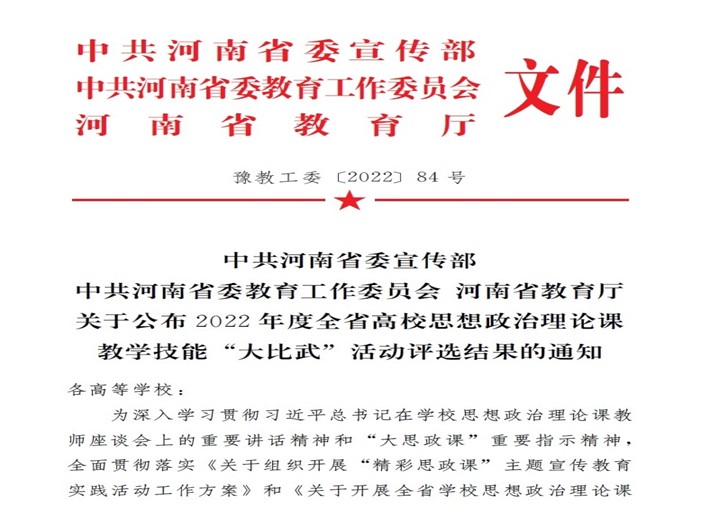 近日,河南省教育厅公布了2022年全省高校思想政治理论课教学技能“大比武”活动评选结果:贝博艾弗森代言体育官网3名思政课教师在河南省思政课“大比武”活动中喜得佳绩,获一等奖5个、三等奖1个,实现重大突破。