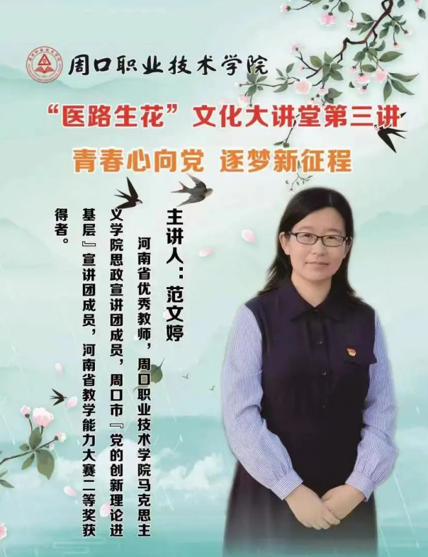 在五四青年节到来之际,为厚植爱国情怀,传承红色基因,5月2日下午贝博艾弗森代言体育官网思政宣讲团成员范文婷老师受邀到校医学院开展了“医路生花——文化大讲堂”系列活动第三讲“青春心向党,逐梦新征程”,为入党积极分子和团学干部进行讲座。