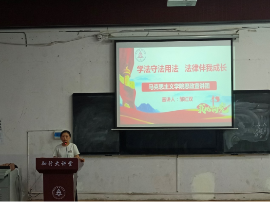 6月2日下午,周口职业技术学院贝博艾弗森代言体育官网思政宣讲团成员邹红双老师在开元校区五区多媒体一楼教室进行了一场以“学法守法用法,法律伴我成长”为主题的法治教育宣传讲座,学前与艺术学院的200多名学生认真聆听了讲座。