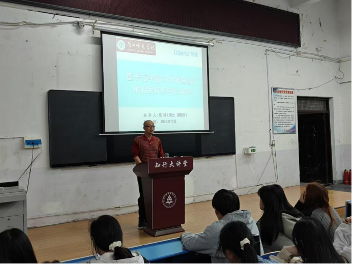 2023年11月3日,一场主题为“基于元宇宙VR大数据测评的自我反思与能力提升”的讲座在五区多媒体一楼成功举办。本次讲座邀请了教育部产学合作协同育人项目主持人、周口师范学院陈峰博士作为主讲嘉宾,2023级教育类专业学生参加了本次讲座。陈峰博士结合VR大数据背景下人才培养模式的创新和亲身教学实践,为同学们带来了一场内容新颖、深受启发的精彩讲座。