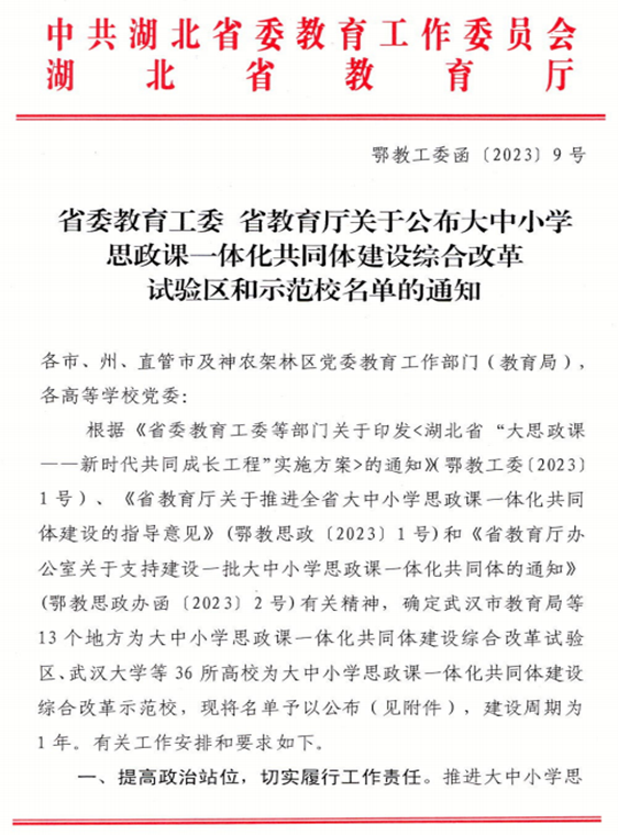 近日,省委教育工委、省教育厅公布全省“大中小学思政课一体化共同体”建设综合改革示范校建设名单。伟德官网获批全省大中小学思政课一体化共同体建设综合改革牵头高校。