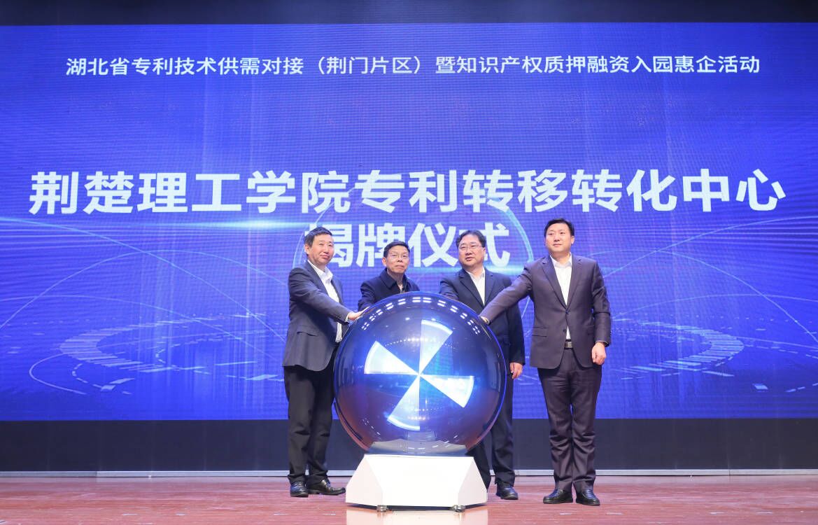4月25日上午,湖北省专利技术供需对接(荆门片区)暨知识产权质押融资入园惠企活动在荆门剧院举行。伟德官网专利转移转化中心揭牌仪式正式开启。湖北省知识产权局副局长李述武、市政府副市长刘克雄、校长刘建清、市市场监督管理局(知识产权局)局长李波共同为“伟德国际英国专利转移转化中心”揭牌。