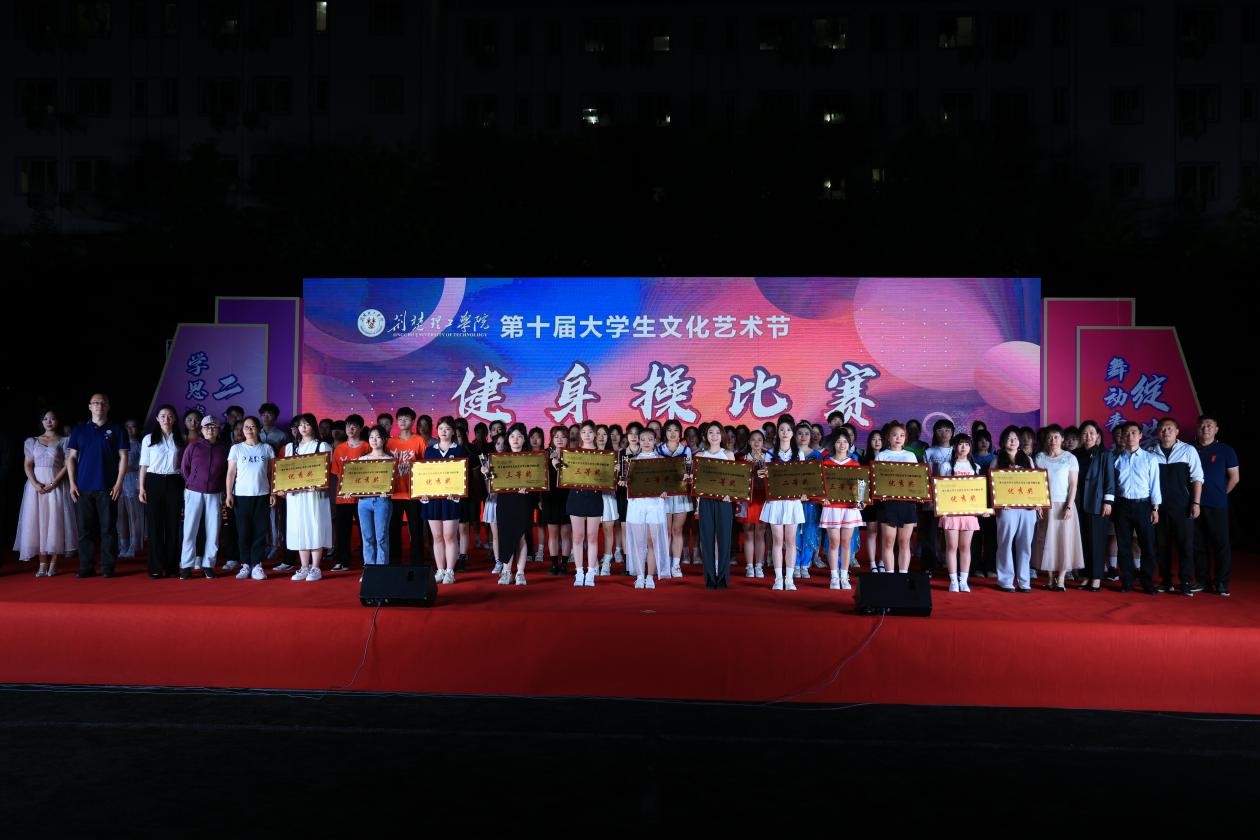 比赛分为徒手操,轻器械两个环节。选手们服饰造型新颖别致,动作整齐划一,用精湛的技术动作与完美的艺术表现为现场观众带来了一场视觉盛宴。各参赛队满怀梦想,用激情和汗水诠释着属于自己的青春和信念,他们个个精神焕发,满怀自信,伴随着音乐的律动起舞,耀眼夺目。经过激烈比拼,经济与管理学院获团体总分一等奖;医学部、电子信息工程学院获团体总分二等奖;艺术学院、师范学院、数理学院获团体总分三等奖;生物工程学院、外国语学院、文学与传媒学院、计算机工程学院、化工与药学院、通用航空学院获优秀奖。