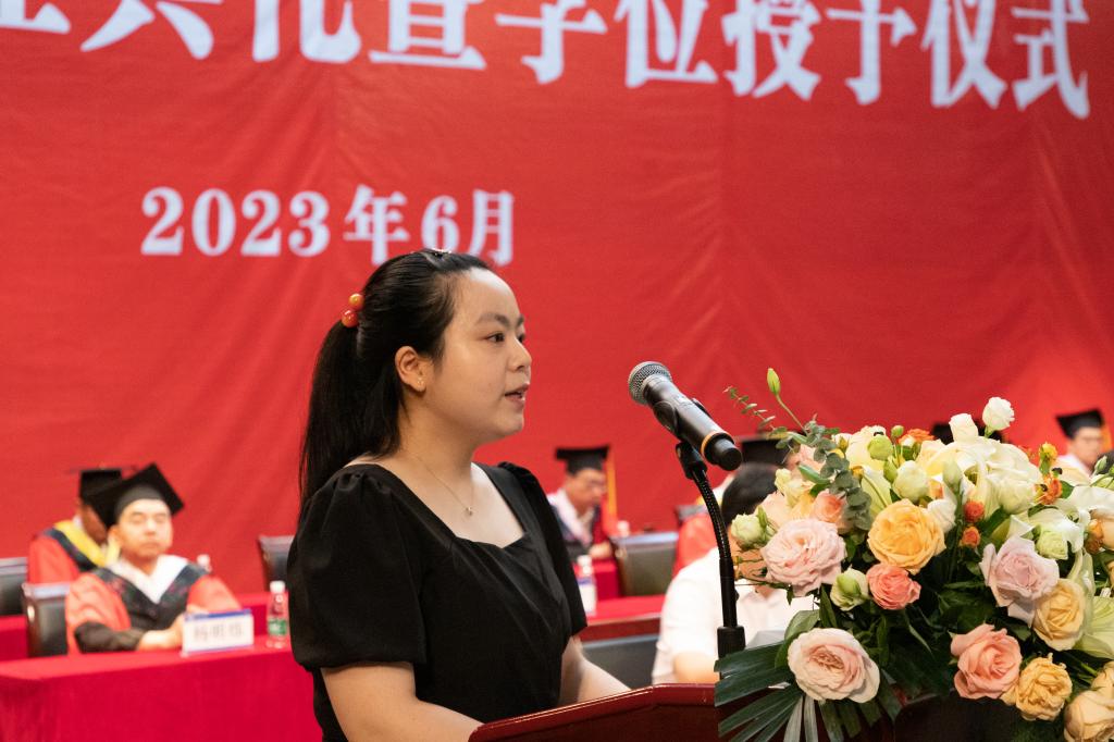 教师代表、生物工程学院刘航博士希望毕业生们将个人理想与家国担当融为一体,保持一颗谦虚的心,继续砥砺前进,直面挑战,不断追梦。