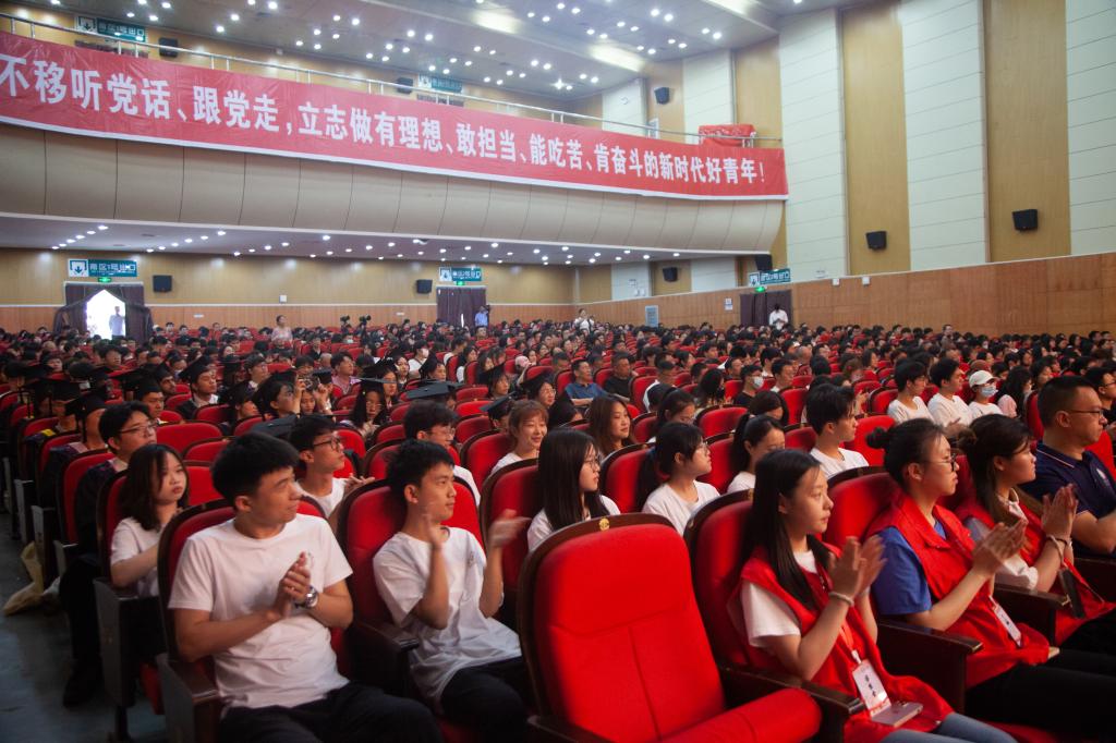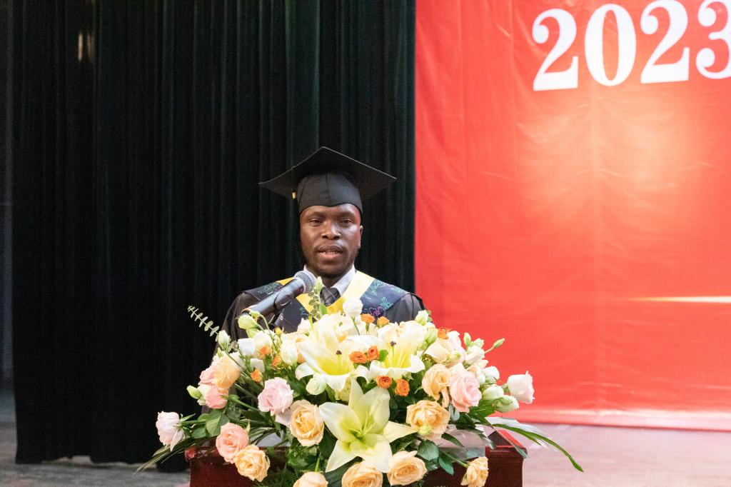 应届毕业生代表、外国语学院杨良宇,留学生代表、国际教育学院杜塞发言,总结了自己在校四年青春时光的收获,表达了对学校的不舍和深深的感谢之情,表示将永远铭记校风校训,在实现中华民族伟大复兴中国梦的新征程上奋勇前进。