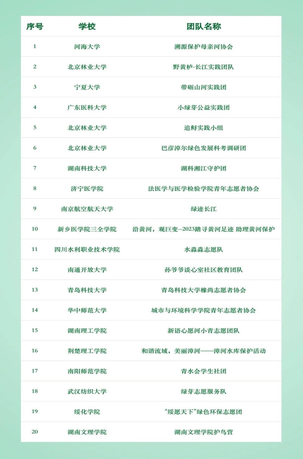 高校“河小青”创新实践活动是共青团结合全国青少年生态文明教育中心“绿色长征”活动所推出,此次活动面向全国高校征集参与团队,最终收到来自64所高校的82份报名表,河流守望者筛选出其中36份优秀方案通过面试,最终确定20支团队。