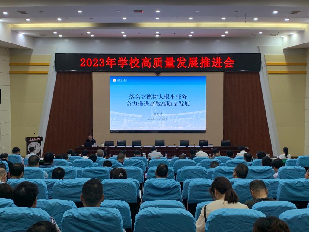 刘建清以《落实立德树人根本任务 奋力推进高教高质量发展》为题,分别从党建引领、人才培养、科技创新、师资队伍建设和民生保障等方面回顾总结2023年上半年工作,全面剖析制约学校高质量发展的突出问题,部署新学期重点工作,并就狠抓落实,以高质量成果助推学校高质量发展提出具体要求。他指出,2023年学校坚持以习近平新时代中国特色社会主义思想为指导,全面学习贯彻落实党的二十大和省第十二次党代会精神,全面贯彻党的教育方针,落实立德树人根本任务,围绕“审核评估”和“达标申硕”目标任务和重点工作,扎实推进内涵发展,持续优化办学条件,坚持统筹安全和事业发展,各项工作取得了新成效、新进展,2023年学校在艾瑞深中国校友会网排名比2017年上升255位。