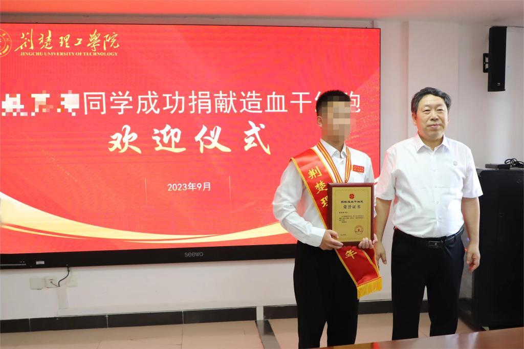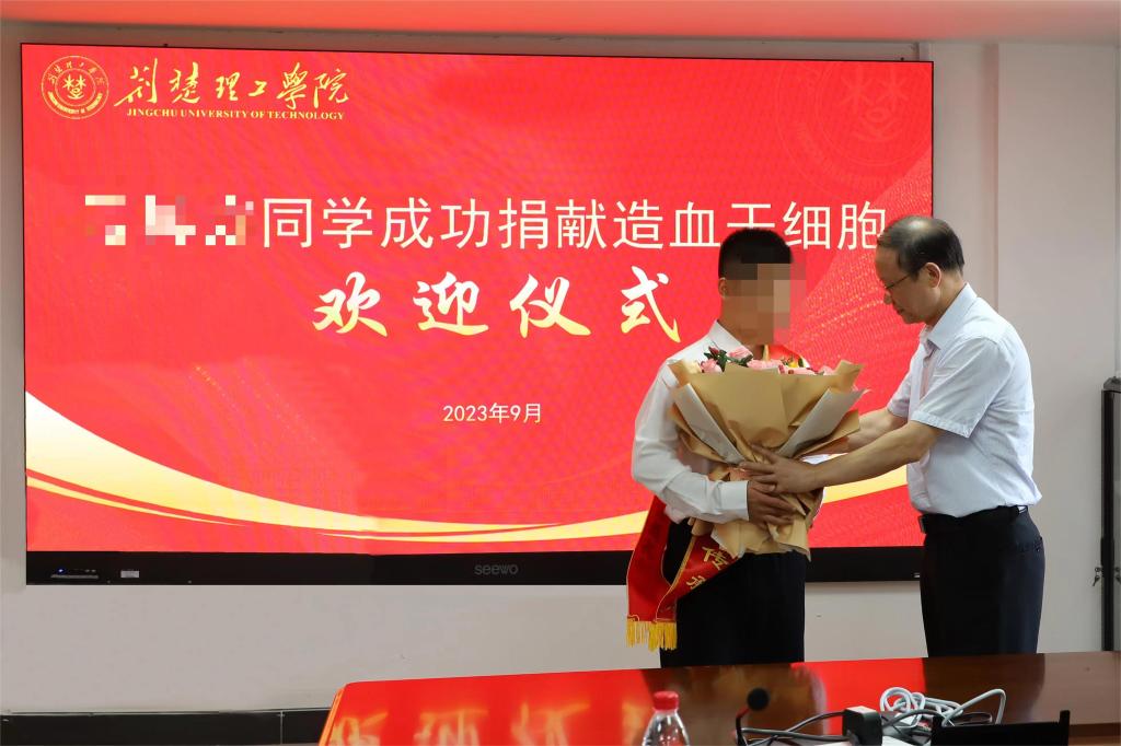 “荆楚青年,大爱无疆”,9月8日下午,伟德官网在行政楼A406会议室举行王虎(化名)同学捐献造血干细胞凯旋欢迎仪式。校党委书记王学民出席并为王虎同学颁发“国家级造血干细胞捐献奖牌”和荣誉证书。市政协副主席、市红十字会常务副会长陈刚出席欢迎仪式。仪式由党委常委、宣传部部长郑艳主持。