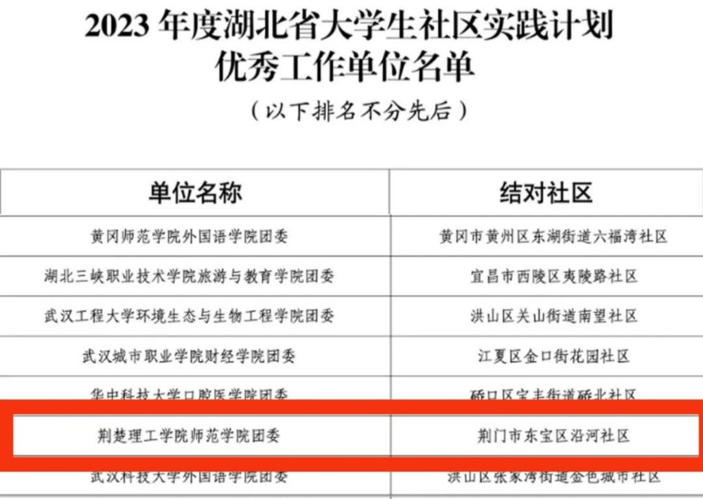 近日,团省委学校部下发了《关于举办湖北省2023年大学生社区实践计划展示活动的通知》,面向全省高校团学组织广泛征集优秀工作案例。师范学院高度重视、积极申报,经团省委学校部审核遴选,师范学院团委被评为优秀工作单位。