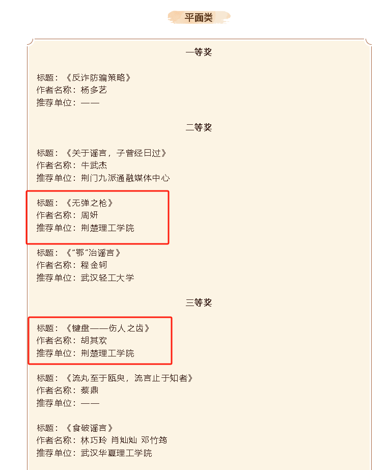 近日,由湖北省互联网违法和不良信息举报中心主办,极目新闻承办的湖北省首届互联网辟谣优秀作品征集评选活动榜单公布。伟德官网选送的艺术学院学生周妍的作品《无弹之枪》(指导老师:金波)、艺术学院学生胡其欢的作品《键盘——伤人之齿》(指导老师:王蕾)分获平面类作品二等奖和三等奖。