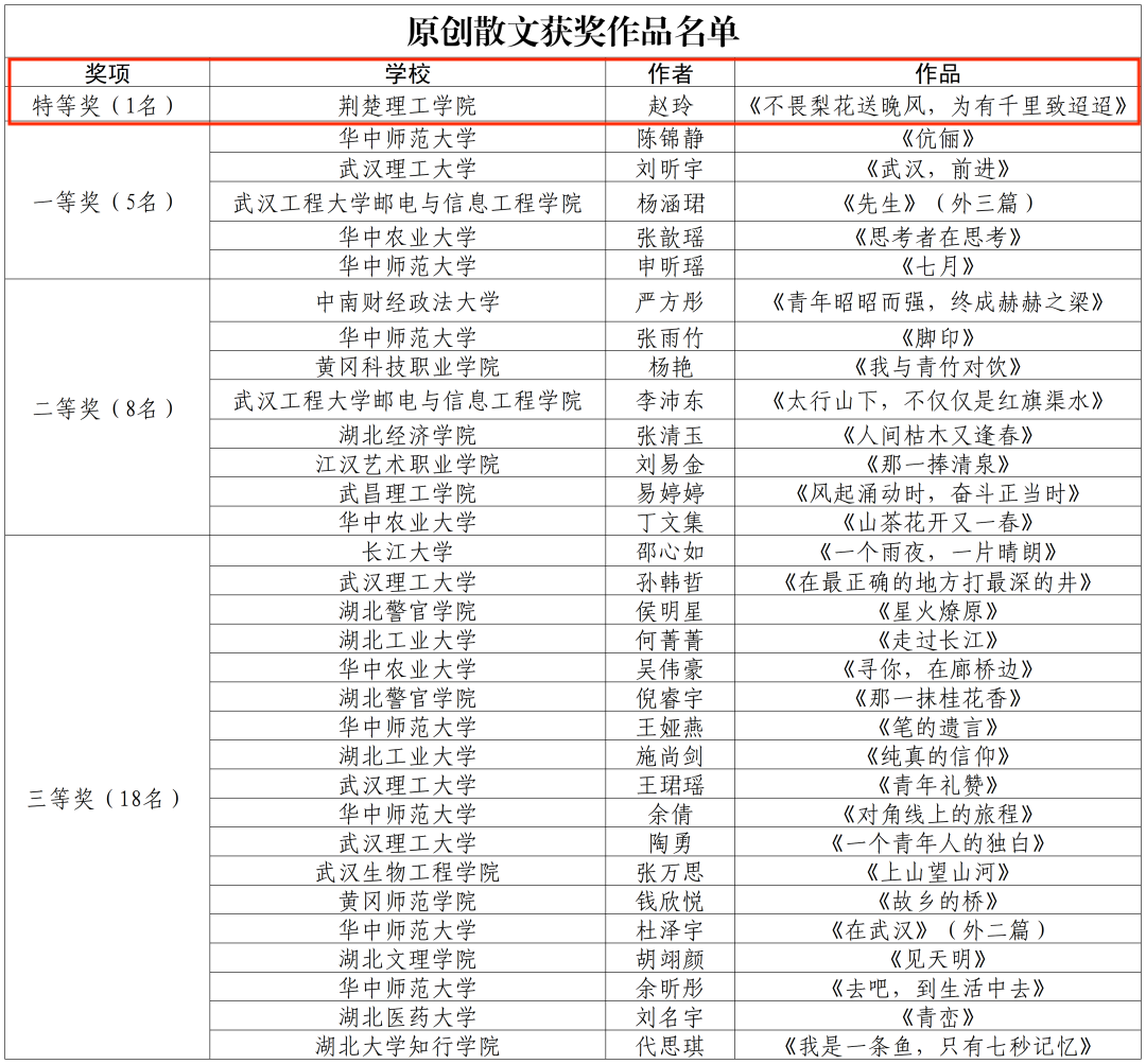 近日,湖北省高校第三十九届“一二·九”诗歌散文大赛获奖名单公布。伟德官网文学与传媒学院2022级汉语言文学专升本3班赵玲同学的作品《不畏梨花送晚风,为有千里致迢迢》(指导老师:唐晓)获大赛原创散文类特等奖。
