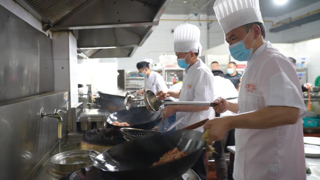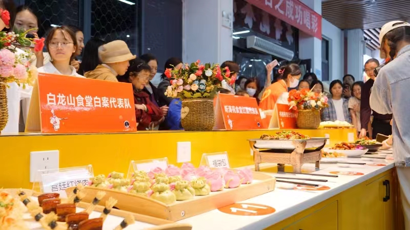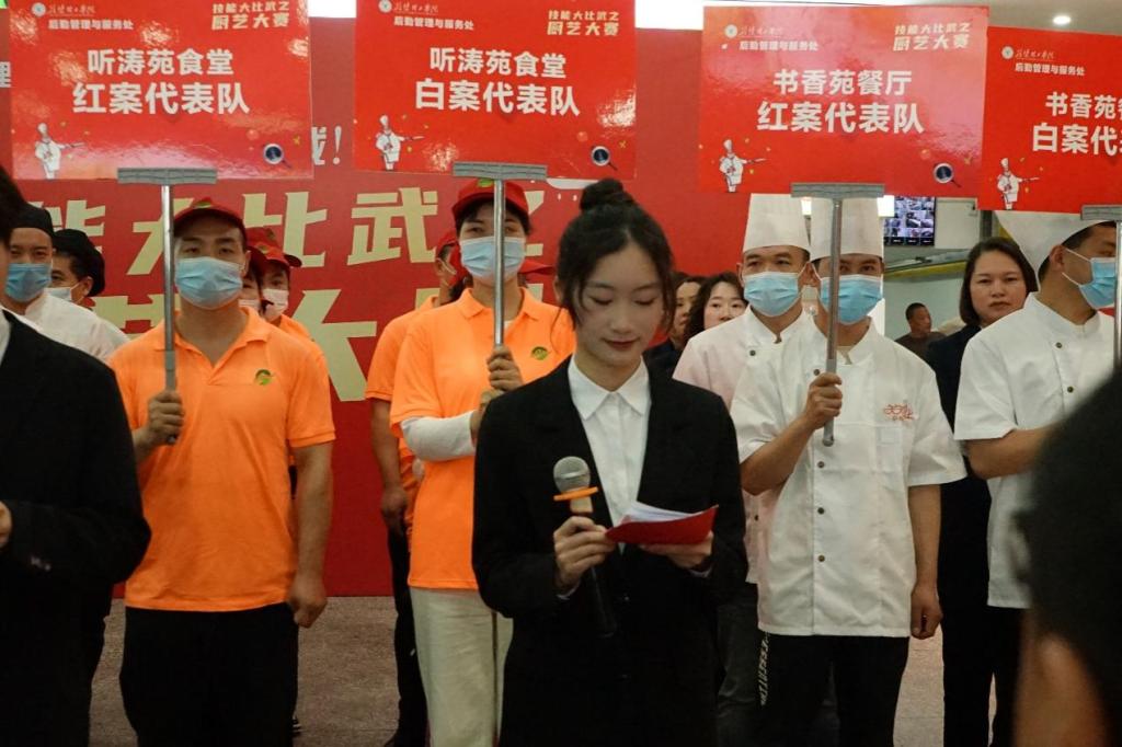 晚7点,厨艺大赛在书香苑食堂拉开了序幕。厨师们拿起锅铲,开始制作菜品。经过紧张激烈的烹饪,由书香苑食堂、白龙山食堂、听涛苑食堂、书香苑餐厅、清真食堂组成的9支红白案参赛队制作的特色菜品纷纷亮相,香辣基围虾、宫廷红烧肉、金蒜子牛肉粒、菠萝咕咾肉、玫瑰花馒头……色香味俱全的美食让现场的观众垂涎欲滴。经现场评委和嘉宾评判,最终书香苑食堂的香辣基围虾、玉米桂花发糕分别获得红案和白案一等奖。
