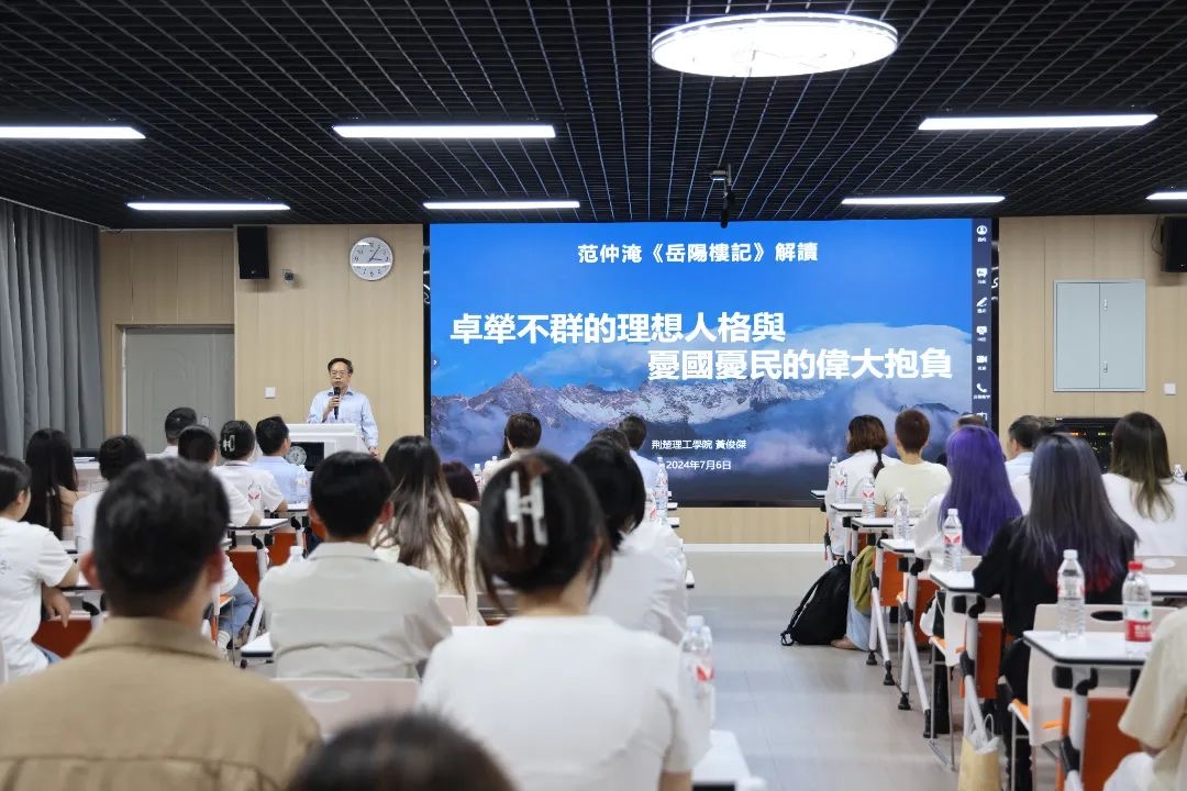 活动前,荆台大学生共同沉浸于一堂意蕴深远的中华文化课之中,聆听了伟德官网黄俊杰教授主讲的《卓荦不群的理想人格与忧国忧民的伟大抱负》——范仲淹《岳阳楼记》解读。“不以物喜,不以己悲”的积极乐观人生态度,“先天下之忧而忧,后天下之乐而乐”的伟大抱负和爱国主义情怀,激起了两岸青年学子的强烈共鸣,课堂上大家交流感想踊跃发言,表现出了对中华优秀传统文化的喜爱。