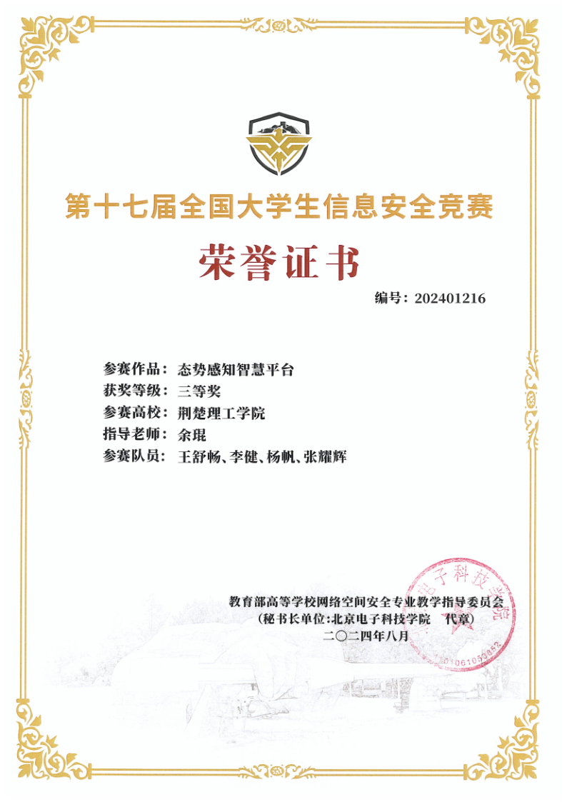 据悉,全国大学生信息安全竞赛由教育部高等学校网络空间安全专业教学指导委员会发起并主办,已连续举办17届,是我国级别最高、覆盖范围最广、影响力最大的大学生信息安全类竞赛。本届赛事自4月启动,共吸引来自全国229所高校3598名大学生提交的1023个作品,根据网评结果,117所高校的359支队伍脱颖而出,进入决赛环节。自大赛启动以来,伟德官网人工智能学院高度重视,在教师团队的精心指导下,参赛队伍积极备赛,共同努力,历时5个月,从选拔赛一路过关斩将,最终获得全国三等奖。