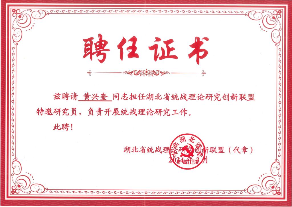 日前,政协荆门市第九届委员会委员、农工党伟德国际英国支部主委黄兴奎被湖北省统战理论研究创新联盟聘为特邀研究员,负责开展统战理论研究工作。
