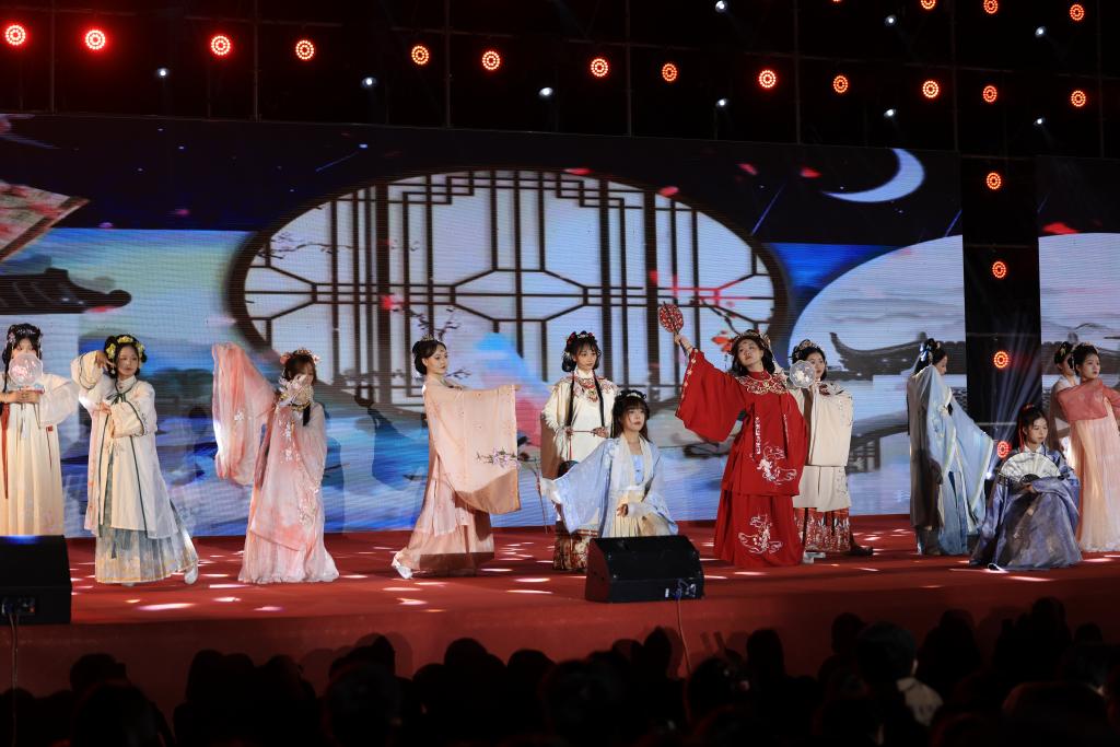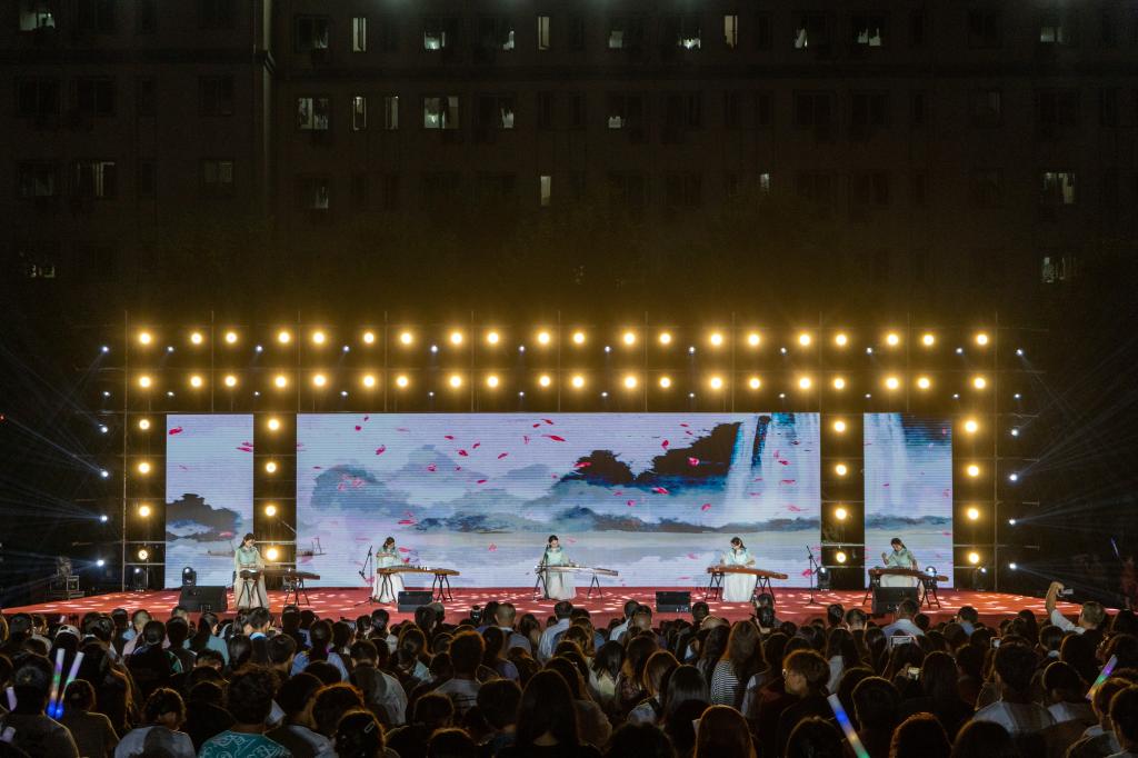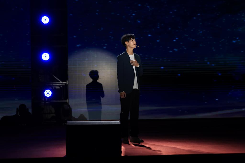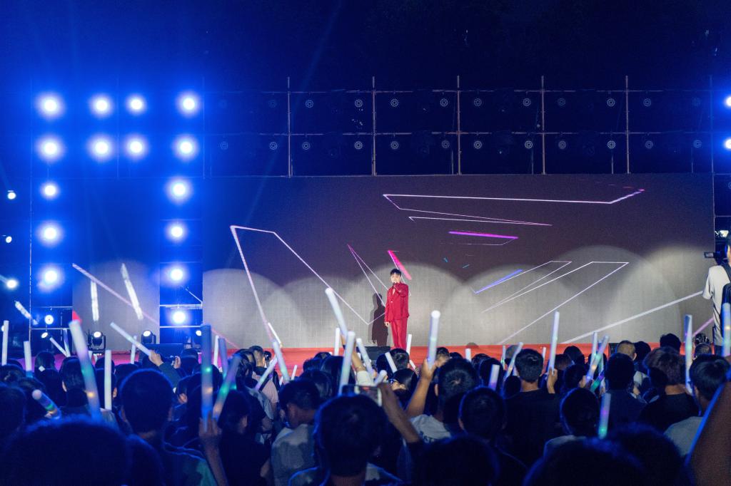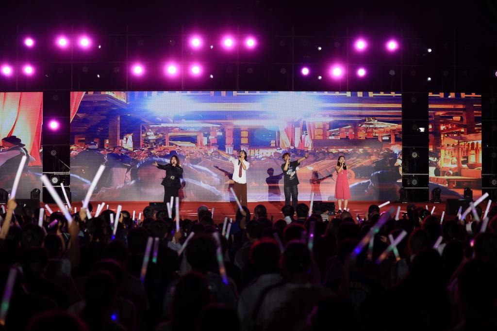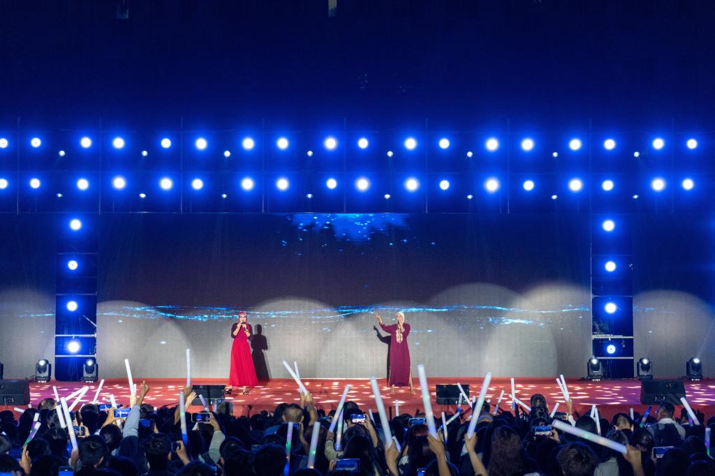 在掌声的余韵里,中外学生联唱歌曲《一路“荆”彩》,用真挚的情感和动人的歌声讲述着荆楚故事,展现了荆门的人文风情和乡村风景名胜,以及荆门近年来的建设和发展成果。随着音乐的节奏,观众们纷纷挥动荧光棒,形成了一片璀璨的光海。2016届校友郑鑫代表作《无言伤悲》也来到了现场,每一个旋律都承载着对过往的青春与不舍,以及对未来无限可能的期许,随着最后一个音符的落下,全场爆发出热烈的掌声和欢呼声。