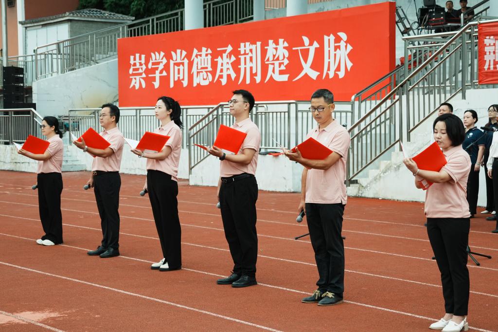 升国旗仪式后,教师代表陈艳、彭英鸾、肖雅桐、袁腾飞、谢长林和罗婕为大家带来诗朗诵《走向辉煌》,让“奋斗”与“传承”的种子悄然种进每位师生的心田。