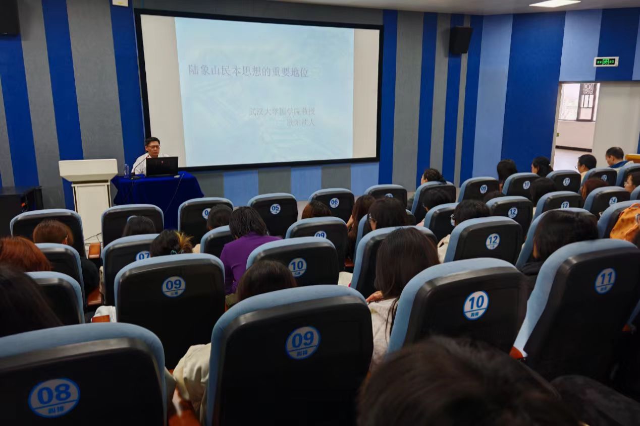 讲座中,欧阳祯人教授以陆象山“心即理”为核心切入点,系统梳理其民本思想的儒学脉络。他深入浅出阐释“宇宙便是吾心,吾心即是宇宙”的哲学内核,着重剖析与“益下为民”实践指向的关联,指出陆象山将“本心”觉悟与民本实践贯通,强调为政者需“发明本心”以体恤民情。随后以陆象山荆门治政实践为例,解读“任贤使能、除弊安民”举措,让师生直观感受民本思想的实践力量。