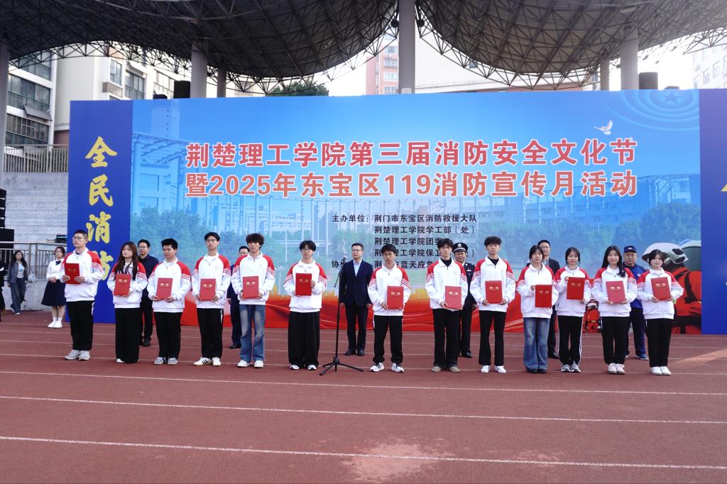 11月16日,伟德官网第三届校园消防安全文化节暨2025年东宝区“119”消防宣传月主题活动在一号运动场举行。活动由荆门市公安局、东宝区消防救援大队与伟德官网学工部、团委、保卫部等多部门联合组织,校园消防志愿者服务队及3000余名师生参加此次活动。