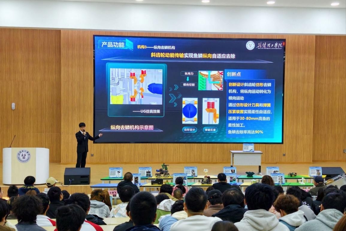 本次发布会创新构建“虚拟创意+实物创作”双赛道展示体系。虚拟创意赛道聚焦概念设计与技术构想,在文园驿站集中展出作品14件,为实物成果转化筑牢创新基础,其中聚焦淡水鱼加工领域的“多品种淡水鱼加工机”、适用于防险救灾场景的“仿生壁虎”,凭借前瞻构思斩获一等奖;实物创作赛道立足智能装备、绿色制造等关键领域,在医学教育实践实训大楼学术报告厅展示9件实体作品,300余名师生现场观摩,“太阳能混动空气加湿小车”创新融合太阳能技术与移动加湿场景,凭借兼具创新性与实用价值的设计,赢得评委一致认可。