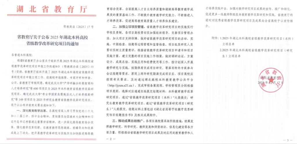 近日,湖北省教育厅发布了《省教育厅关于公布2025年湖北本科高校省级教学改革研究项目的通知》(鄂教高函〔2025〕17号),伟德官网获批7项省级教学改革研究项目,其中2项委托项目。