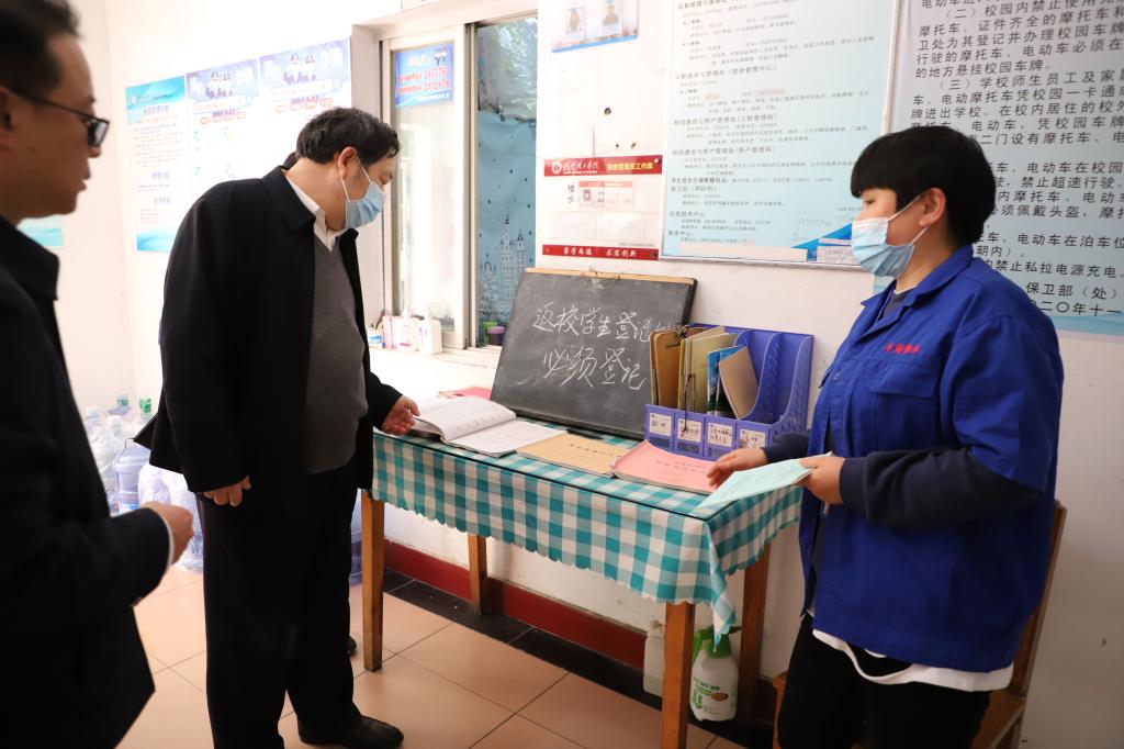 校领导在南一门、南二门认真查看师生出入登记情况、体温检测记录情况。王学民叮嘱值班值守人员要认真履行职责,严格执行校园疫情防控要求,守好校园安全第一道防线。