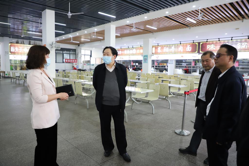 在书香苑食堂,王学民详细了解食堂环境卫生及保洁消毒、食品留样记录、工作人员日常防疫等情况,强调要严格落实疫情防控工作要求和食品安全管理规定,切实为师生做好服务保障。