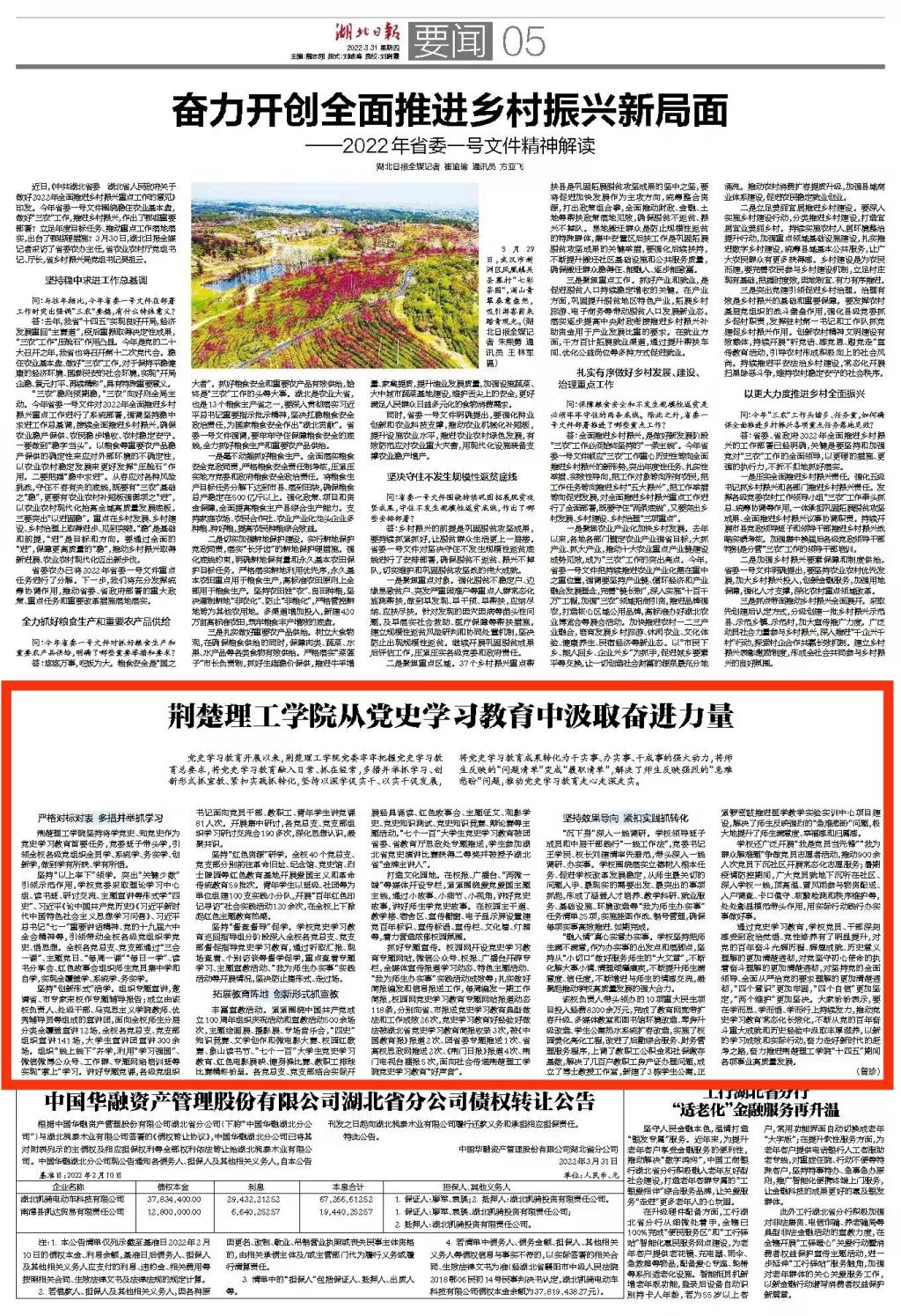 3月31日,《湖北日报》第5版以长篇通讯形式,以《伟德国际英国从党史学习教育中汲取奋进力量》为题,对伟德官网党史学习教育亮点工作和积极成效进行了专题报道。