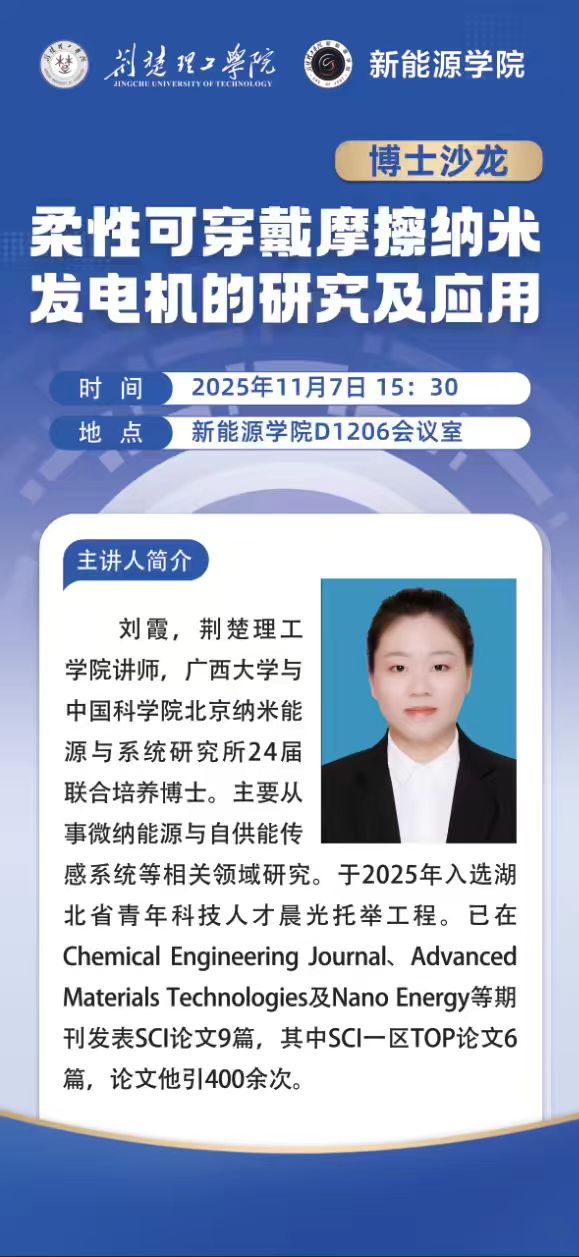 11月7日博士沙龙预告:柔性可穿戴摩擦纳米发电机的研究及应用