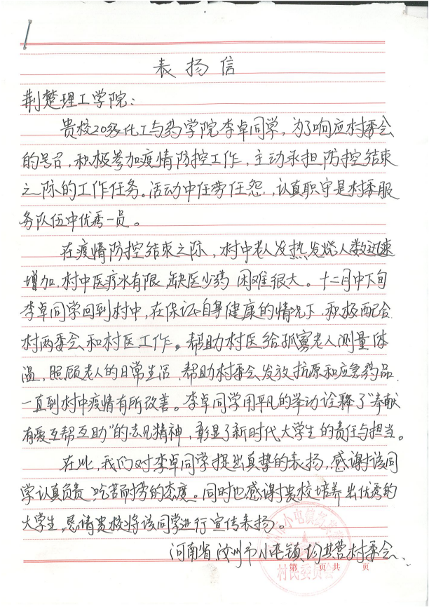 近日,学校收到一封来自河南省汝州市小屯镇杨其营村村委会的表扬信,对伟德官网化工与药学院2020级复合材料与工程专业的李卓同学在返乡后主动参与村委防疫工作期间的辛勤付出及无私奉献表示感谢,并对伟德官网人才培养工作给予高度评价。