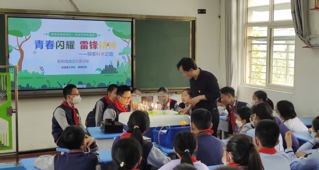 数理学院科普团学生党员蒋席秦表示:“走进小学普及科学知识,让我在实践中受教育、长才干。传承雷锋精神、弘扬社会美德,这是我们青年学子能够做的,也是应该做的!”
