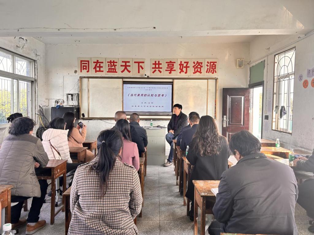 建阳小学地处十里铺镇外围,多年扎根乡村教学一线。民盟学院总支向学校捐赠了校园体育用品,总支副主委云刚为学校师生上了一堂生动的“当代美育认知与思考”公开课。
