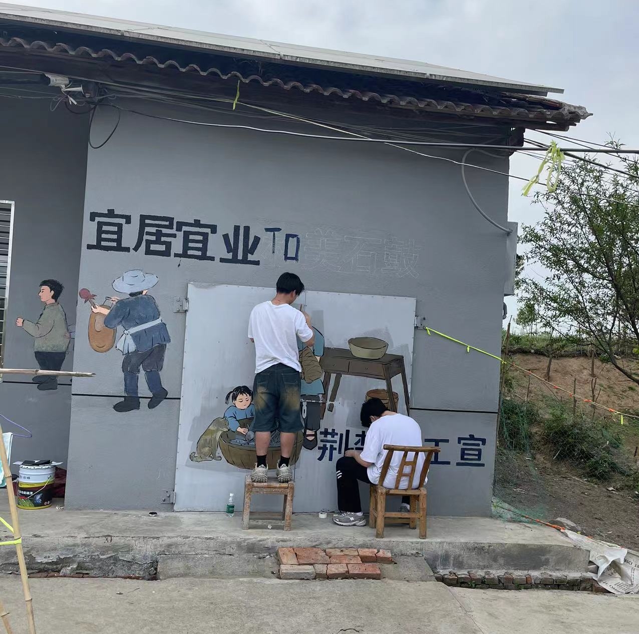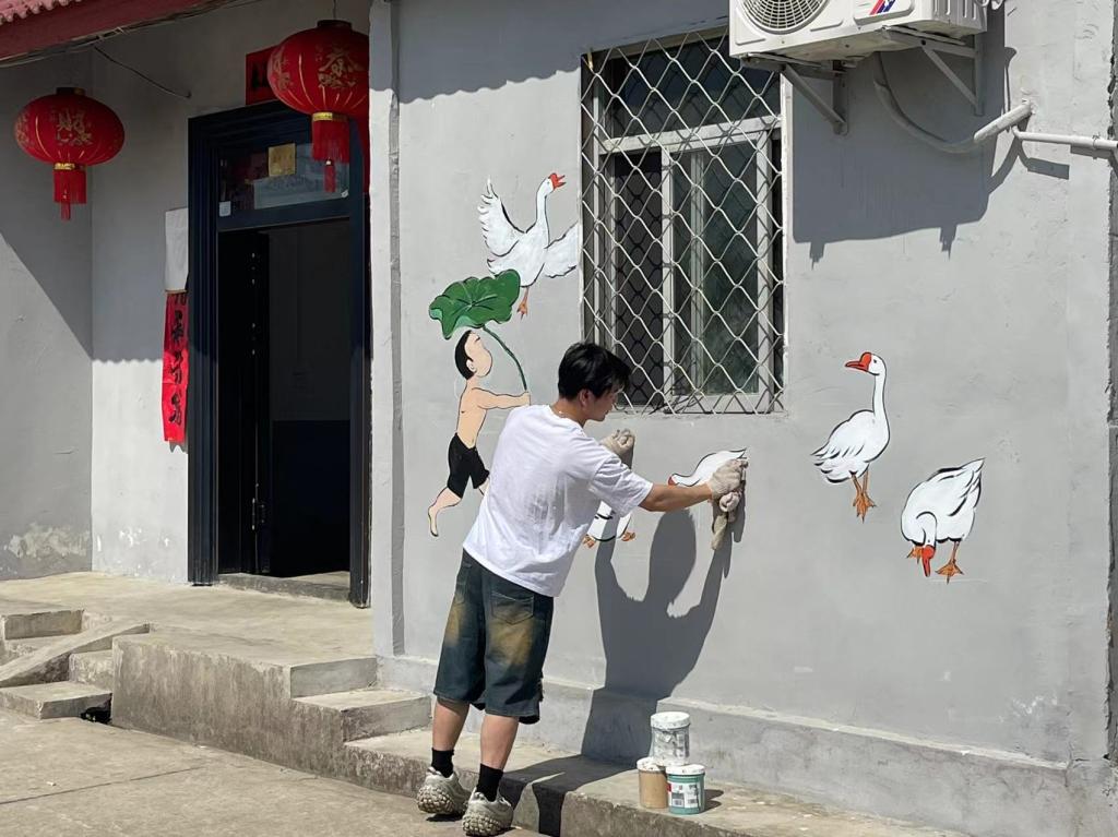 本次墙绘以“宜居宜业,和美石鼓西湾子”为主题,志愿者们积极发挥专业特长,以墙为画布,将石鼓村的主产业--虾稻田为主要表现对象,用画笔描绘了当地的乡风民俗,用丙烯渲染和美乡村。构图、填色、勾边、完善细节……一幅幅精美画卷在他们手下一一铺展开来,油菜花、稻田、秋收、夏荷等景象跃然于墙上,让冷冰冰的墙面,有了色彩斑斓的温度,展现出乡村的内在精神风貌。