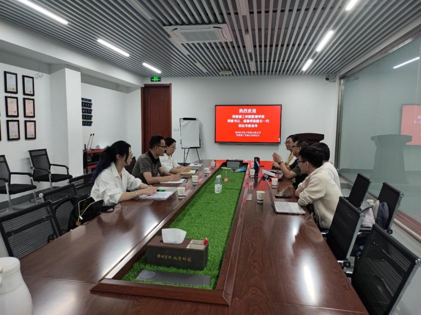 走访首站,数理学院一行抵达南京校友企业托肯电子科技有限公司,受到江苏校友会副会长王鸿铭等校友的热烈欢迎。范迎燕秘书长全面介绍了江苏校友会成立一年来的工作成效、校友活动及未来规划。江苏校友会常务副会长王鸿铭介绍了托肯电子科技有限公司的运营、产品、人才需求等情况。副会长潘书文分享了其自营公司南京袋鼠星传媒有限公司在内容创作、品牌运营等领域的创新实践,提出人才需求。校友代表、南京信息工程大学刘仁强教授围绕“新工科背景下的人才培养模式创新”“校企协同育人的痛点与破局”等议题展开交流,并对校友会如何优化资源整合、提升服务效能提出系统性建议。