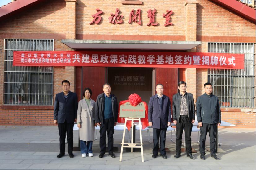 为推进习近平新时代中国特色社会主义思想“进教材、进课堂、进头脑”,深入探讨及构建“大思政课”格局,积极探索思政课育人新模式,12月6日下午,周口职业技术学院与周口市委党史和地方史志研究室共建思政课实践教学基地签约暨揭牌仪式在周口方志馆举行。周口职业技术学院党委副书记、工会主席郭汝礼,周口市委党史和地方史志研究室主任谢留定出席活动。
